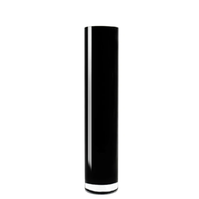 The black vase is produced with an inlay process by forming a glob of molten black colored glass as the inner core then dipped into a coat of molten, clear glass on the exterior. Once the molten glass is blown to the designed form, it undergoes a flashing process to ensure proper fusion. As a result, the colored vase has scratch-resistant surfaces. This particular style is ideal as a statement showpiece in luxury apartment lobbies, in upscale hotel entrance consoles, or in high-end restaurant entrances. Cylinder vases are also great for floral or floating candle arrangements, arts and crafts, or candle making.