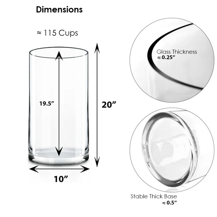 Cylinder vases are great for floral or floating candle arrangements, arts and crafts, or candle making. They make excellent centerpieces for parties and are wonderful home decor pieces. They are ideal for weddings, anniversaries, and all kinds of special occasions, especially when fresh bouquets are called for. These vases are dishwasher safe. Flowers and other accessories are not included.