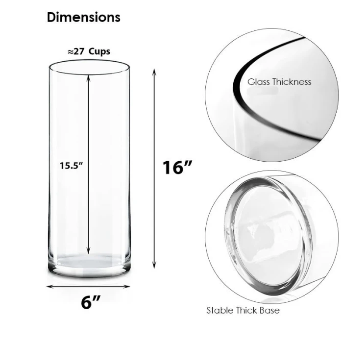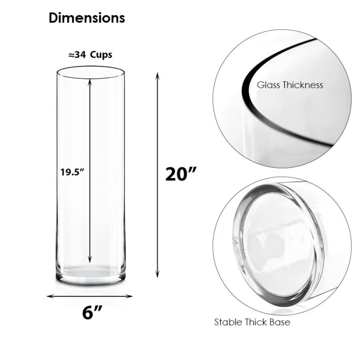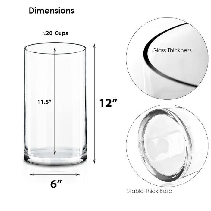 Cylinder vases are great for floral or floating candle arrangements, arts and crafts, or candle making. They make excellent centerpieces for parties and are wonderful home decor pieces. They are ideal for weddings, anniversaries, and all kinds of special occasions, especially when fresh bouquets are called for. These vases are dishwasher safe. Flowers and other accessories are not included.