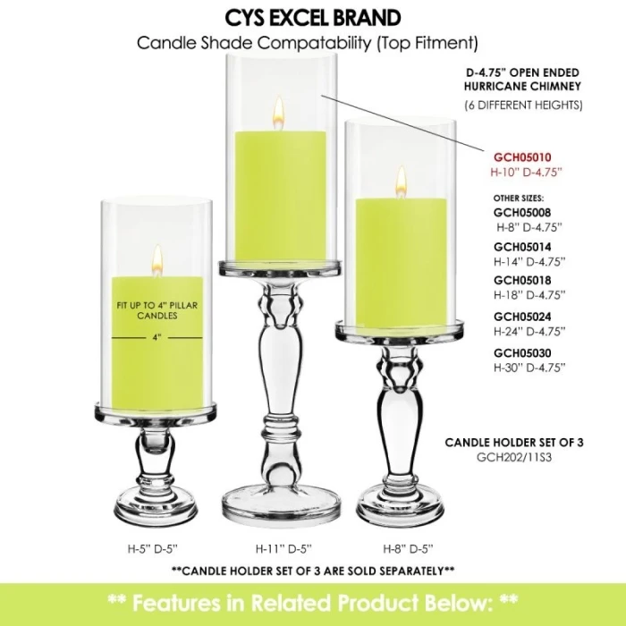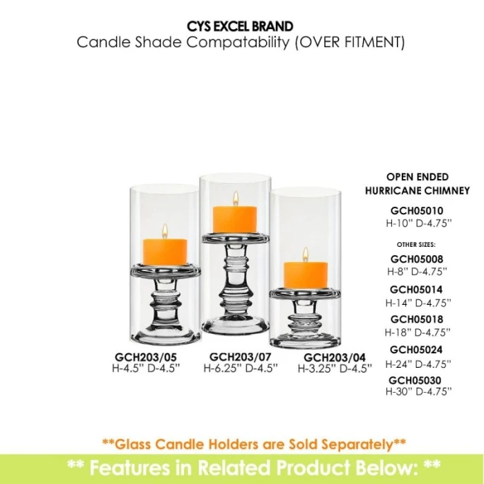 Our elegant open-ended glass hurricane shades are easy to place over candles and easy to remove, while still providing protection for open flames. The contemporary design of the hurricane candle holder gives an impressive display in your home and special events. It’s an astonishing bottomless cylindrical shield to cover votive and short pillar candles for open flame candles. No more dripping wax onto the side of the glass.