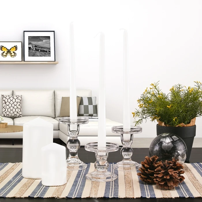 Glass Taper Candle Holders. H-3.75″, 4.5″, 5.5″, D-3.25″ (Wholesale Pack Of 24 Pcs)