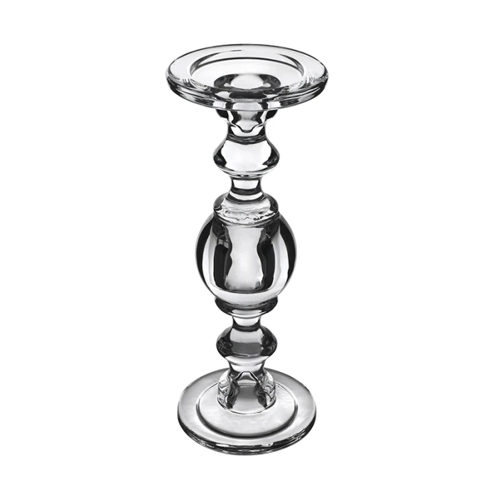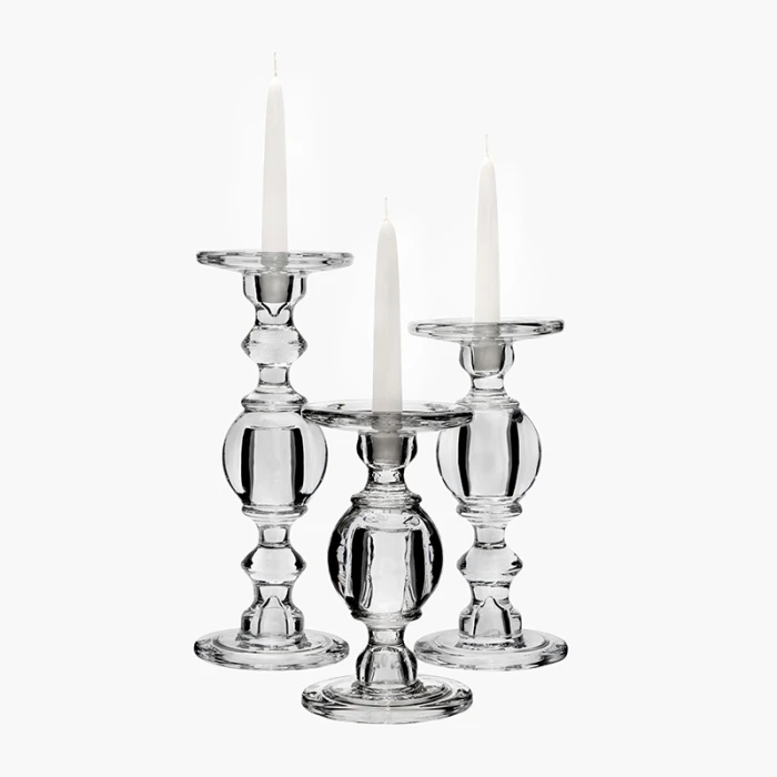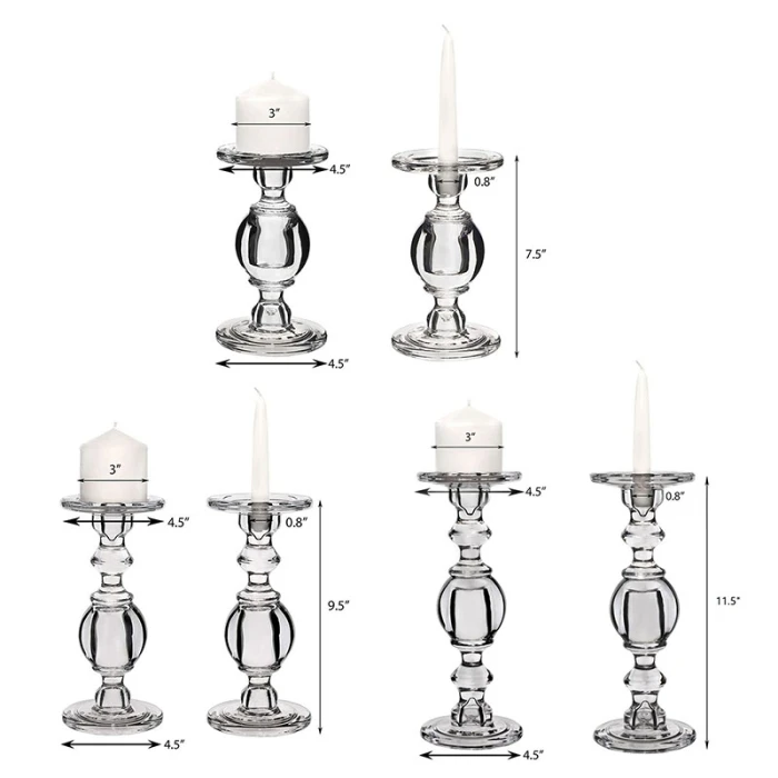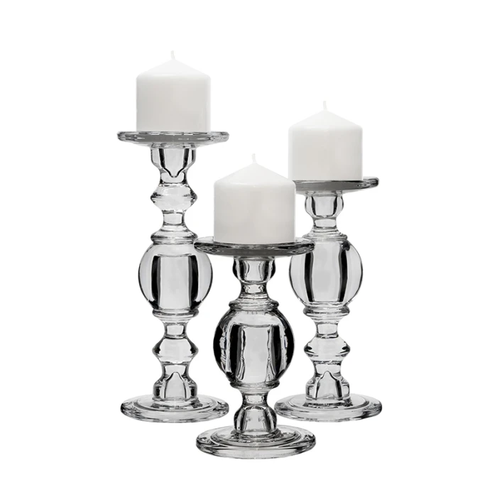 ANGELIC VINTAGE DESIGN – Each clear glass candlestick in this set features a globular balustrade design in staggered heights. Fits pillar candles (up to 4 inches wide), and taper candle sticks.