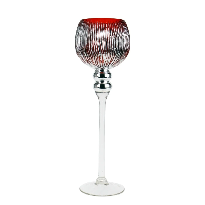 Three sets of 3 long stem candle holders for floating candles (Total of 9 pcs). The gorgeous etched finished design has its unique classic elegant look. The long stemmed red glass design with numerous clear transparent etched clear stripes allows any candle color to gleam in its surroundings. A popular design for these elegant candle holders is to arrange an array of candles in varying heights for a dynamic layout.Â
